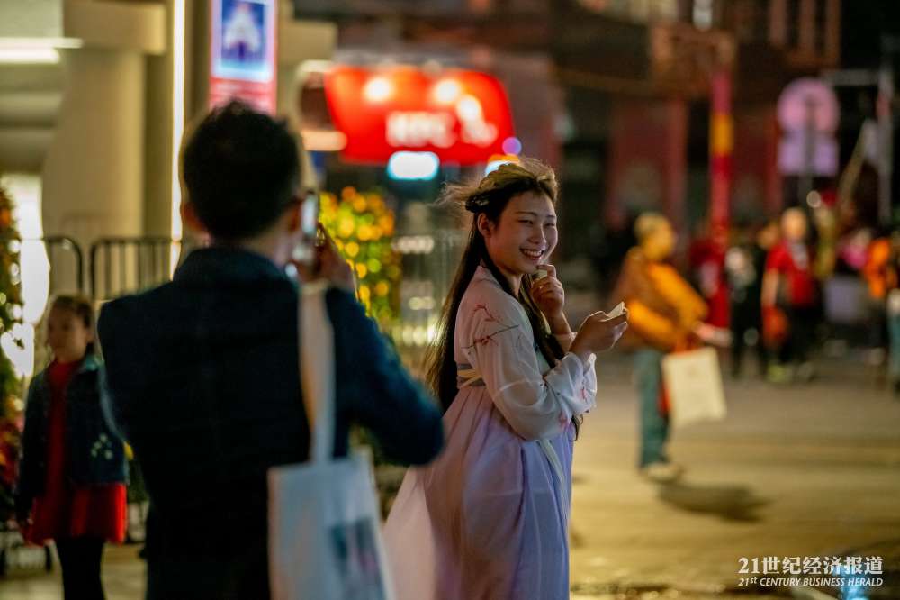游客在西湖花市牌坊灭灯前抓紧拍照留念。