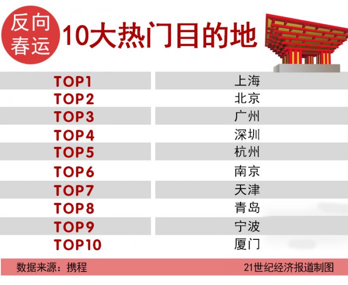 携程大数据显示,春运期间上海、北京、广州、深圳、杭州、南京、天津、青岛、宁波、厦门反倒成了十大热门目的地。上周飞往这些城市的机票预订量同比增长超过40%。在反向过年的购票群体中,80后占比接近七成。
