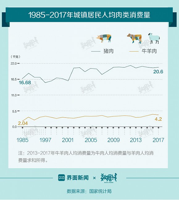 与猪肉相比,牛羊肉的人均消费水平较低。2016年,牛羊肉的人均消费量达4.3千克,创历史新高。而在此前的25年间,牛羊肉人均消费一直保持在3千克以上的水平。