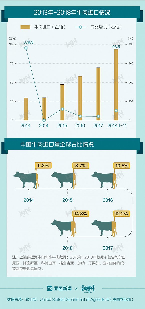 虽然牛羊肉消费增速放缓,但牛肉进口量却显著增长。中国农业部数据显示,2013年至2018年(前11月),中国牛肉进口量由29.4万吨,涨至93.5万吨。从进口增速来看,2013年中国牛肉进口量同比增长379.3%,随后趋于平缓,2018年反弹至50.7%。