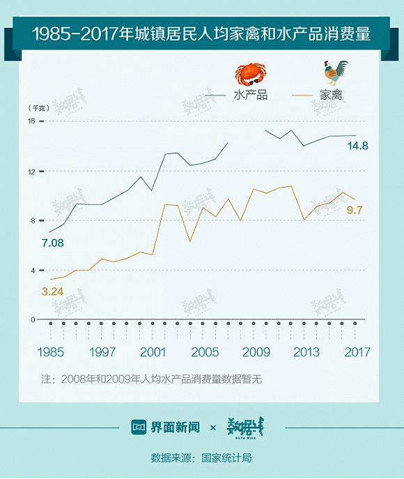 国家统计局数据显示,30多年来,城镇居民家禽人均消费量增长显著,1985年人均消费量仅为3.24千克,2017年已涨至9.7千克,增长近3倍。同时,消费增长显著的还有水产品。2017年,水产品的人均消费量达14.8千克,是1985年(7.08千克)的2倍多。