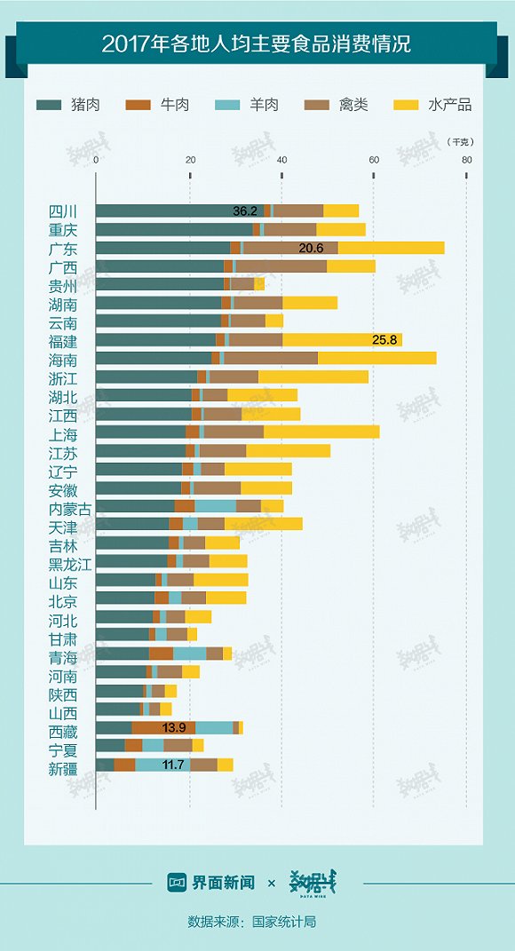 各地肉类消费有哪些偏好?据界面数据(公众号ID:shujuxian_kuaikan)统计,2017年四川人均猪肉消费量居首位,达36.2千克。西藏和新疆的牛羊肉人均消费最高,分别达13.9千克和11.7千克。从禽类和水产品消费情况来看,广东人均消费禽类最高(20.6千克),福建则偏爱水产品(人均消费25.8千克)。