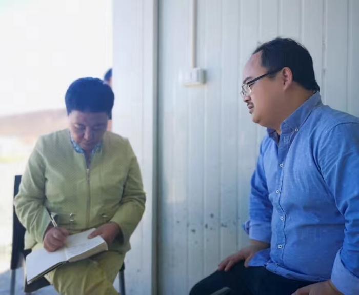 采访LB项目行政主管胡擎松(右)。
