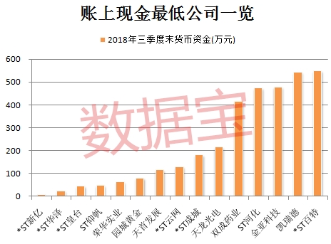 *ST皇台2018年三季度末账上现金45.22万元。1月22日,*ST皇台公告表示,公司预计2018年净利润亏损0.7亿元至0.9亿元,若2018年度经审计的净利润继续为负值或净资产继续为负值,公司股票将在2018年年度报告披露后面临被暂停上市的风险。除上述个股,ST仰帆、荣华实业、园城黄金账上现金也不足百万元。
