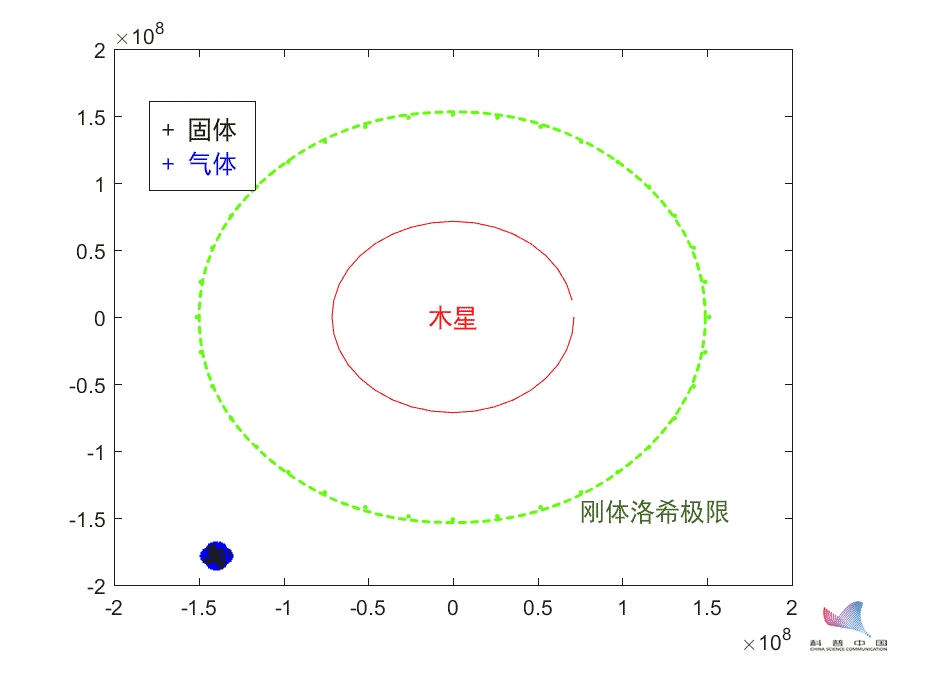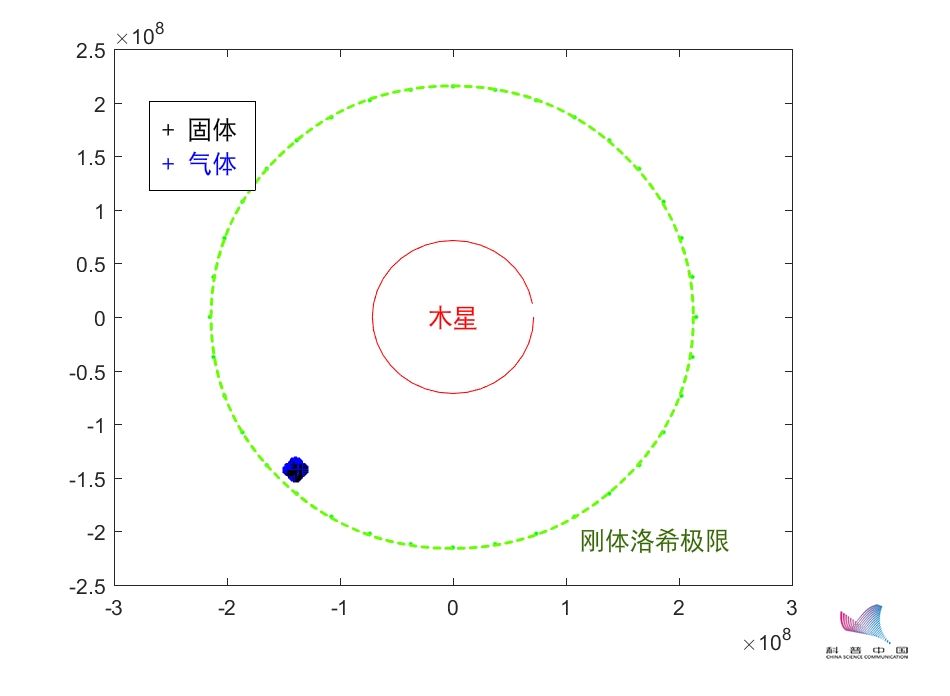▲图e 地木刚体洛希极限模拟(二维简化模型)