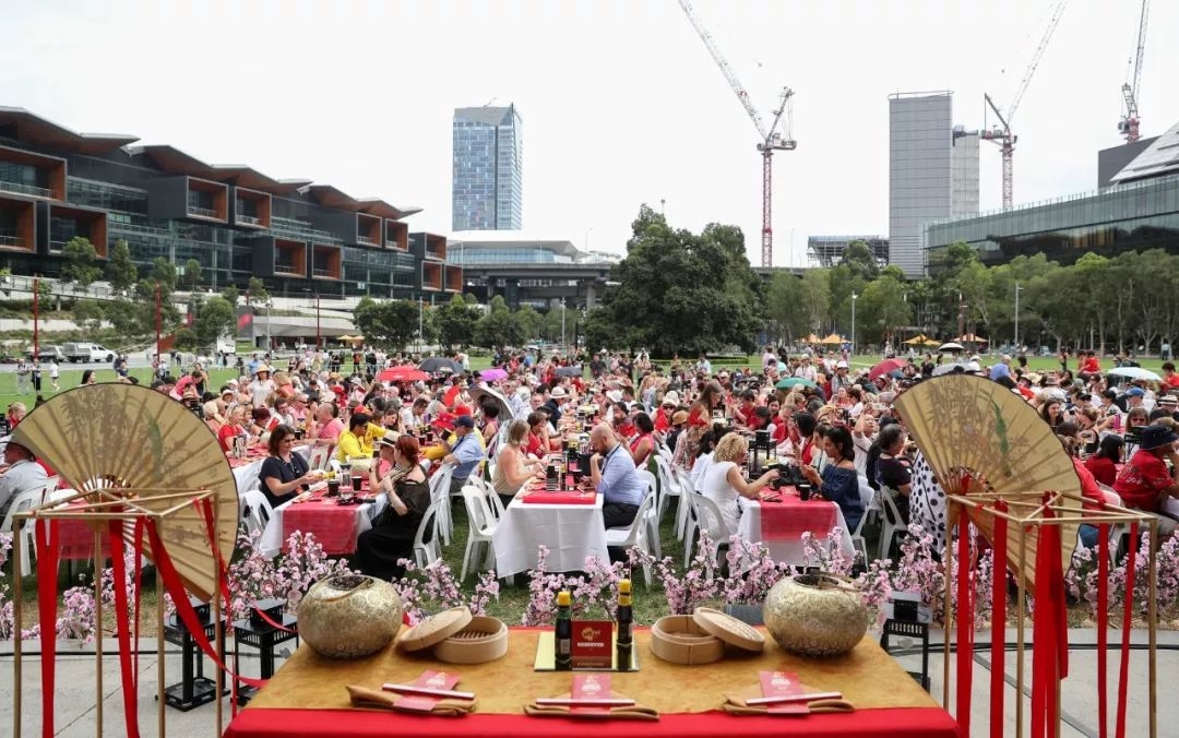 5日,澳大利亚悉尼市中心达令港的通巴隆公园内,一列列长桌整齐摆放,远处的舞台上装饰着扇子、灯笼等中国传统文化符号。场地外,早早聚集了数百名澳洲民众和游客,等候入场的队伍排起长龙。