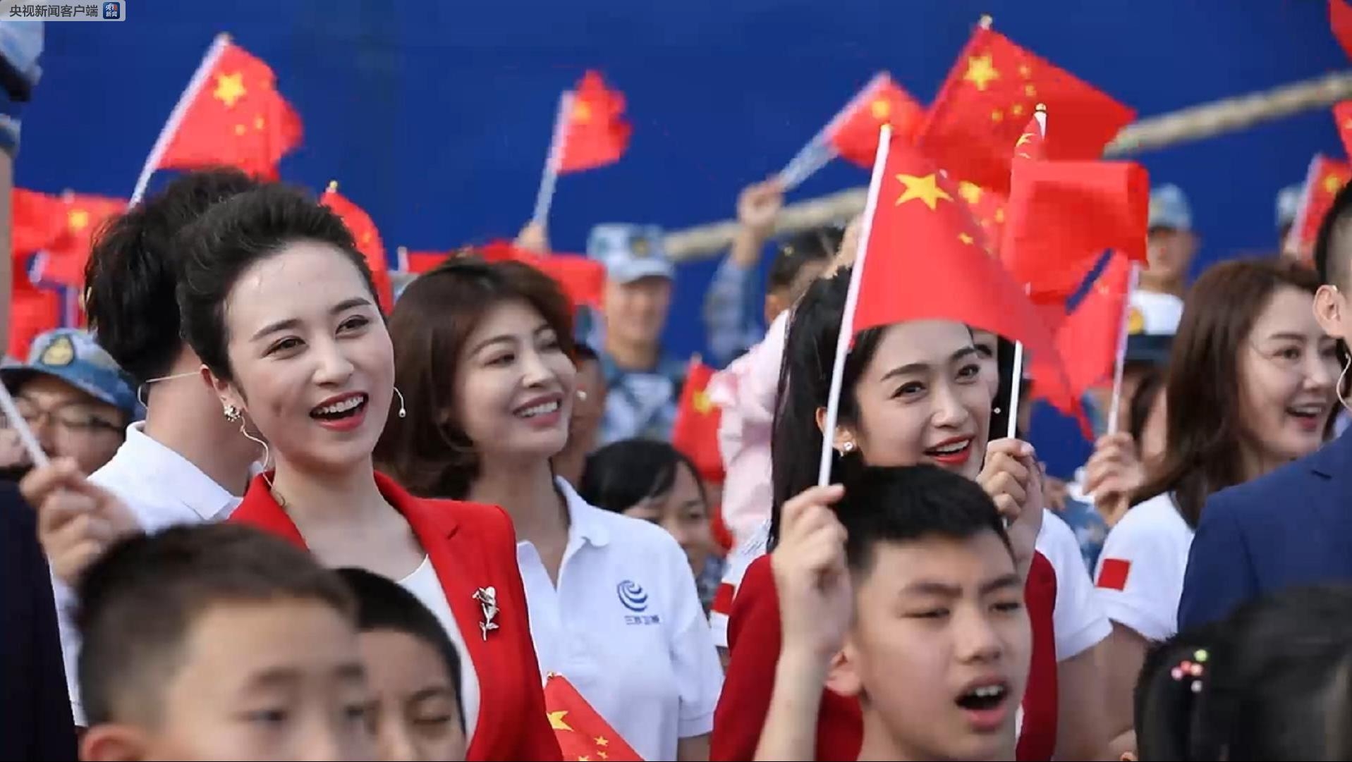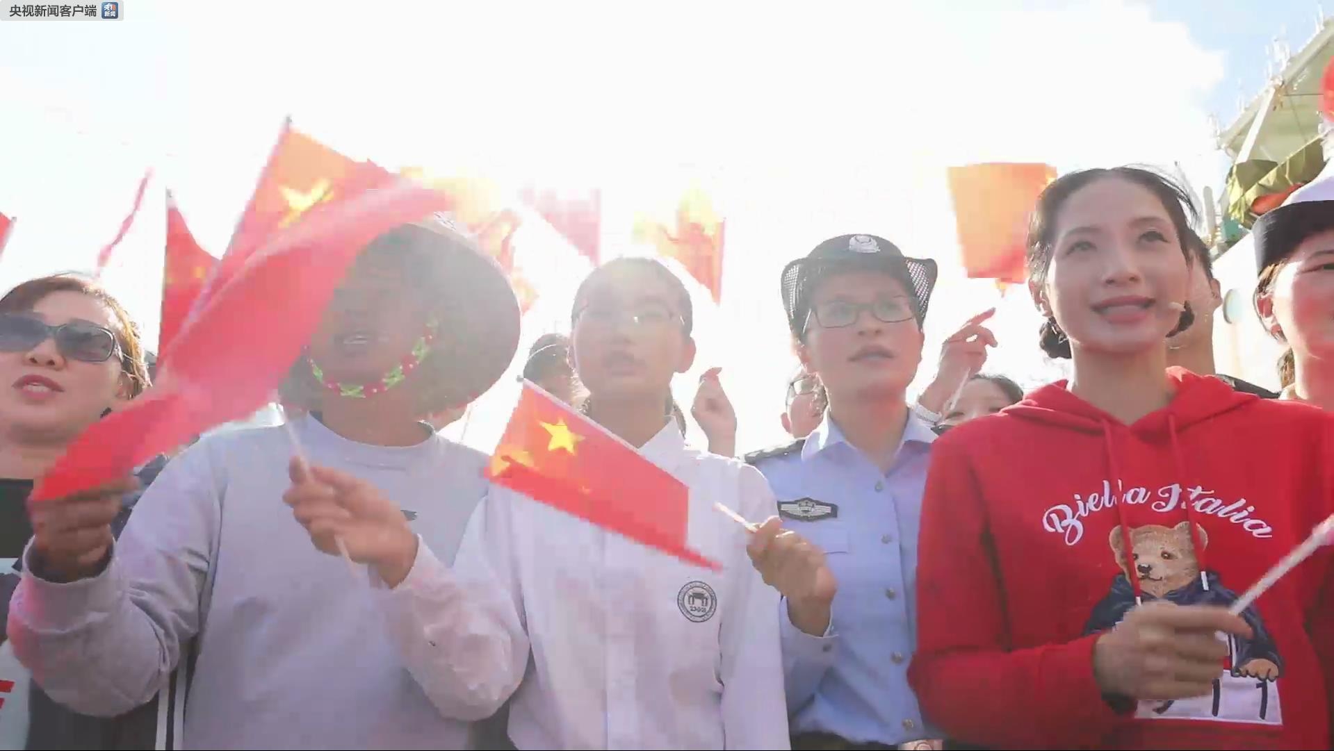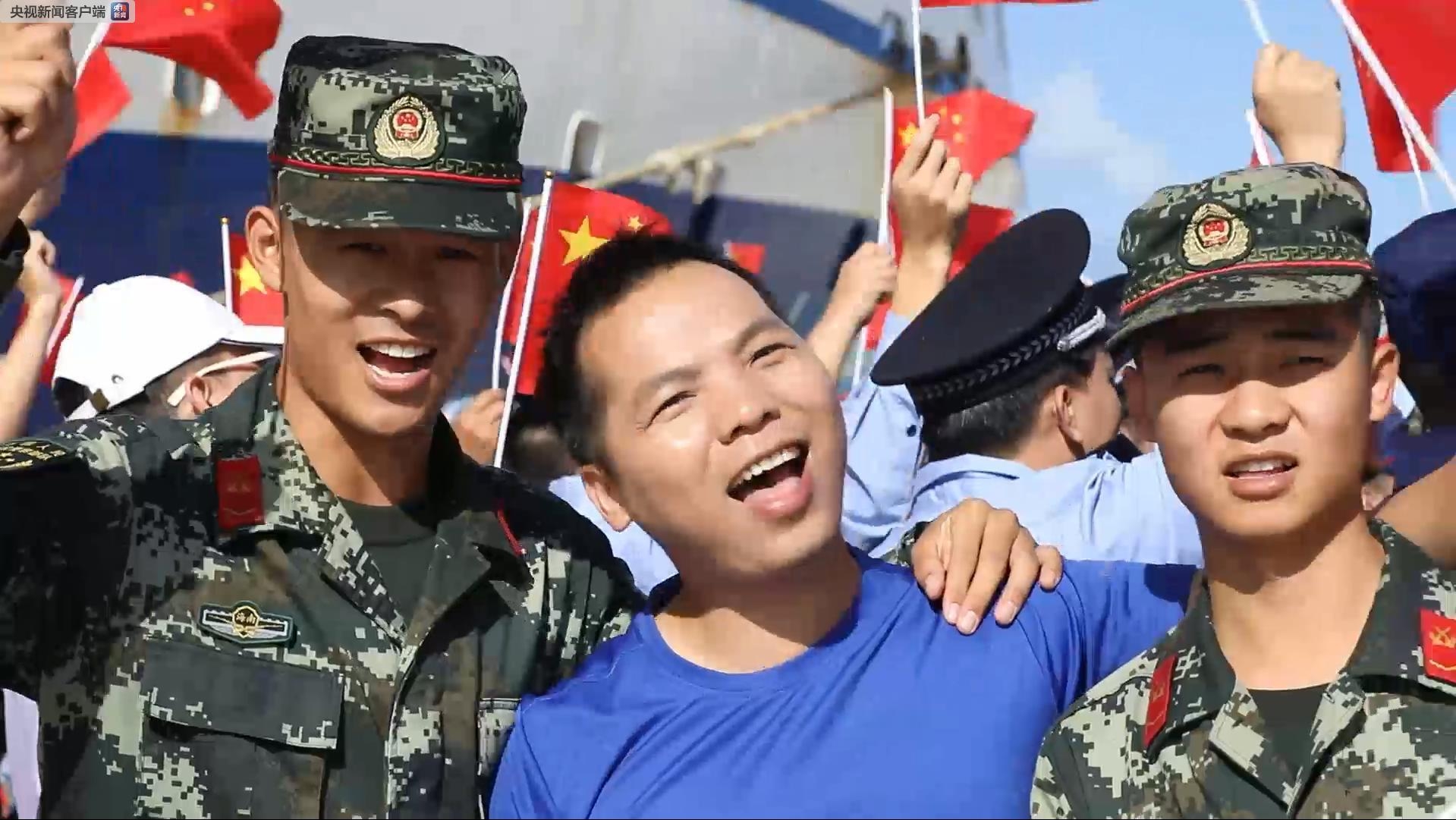 △三沙市工作人员、渔民和驻市部队官兵挥舞着国旗,加入合唱