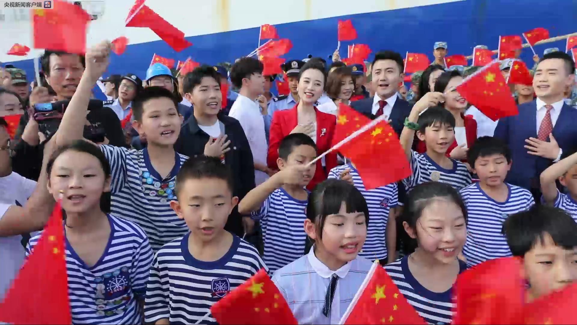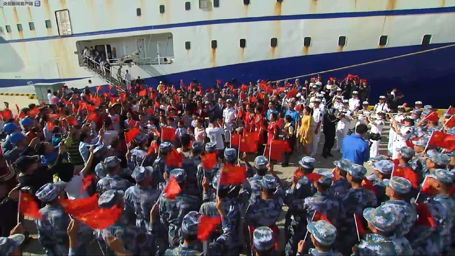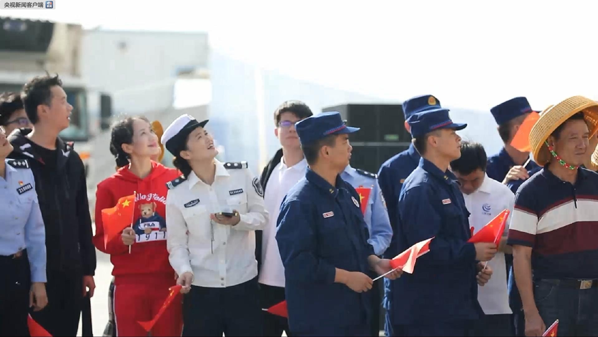 △三沙市工作人员、渔民和驻市部队官兵挥舞着国旗,加入合唱