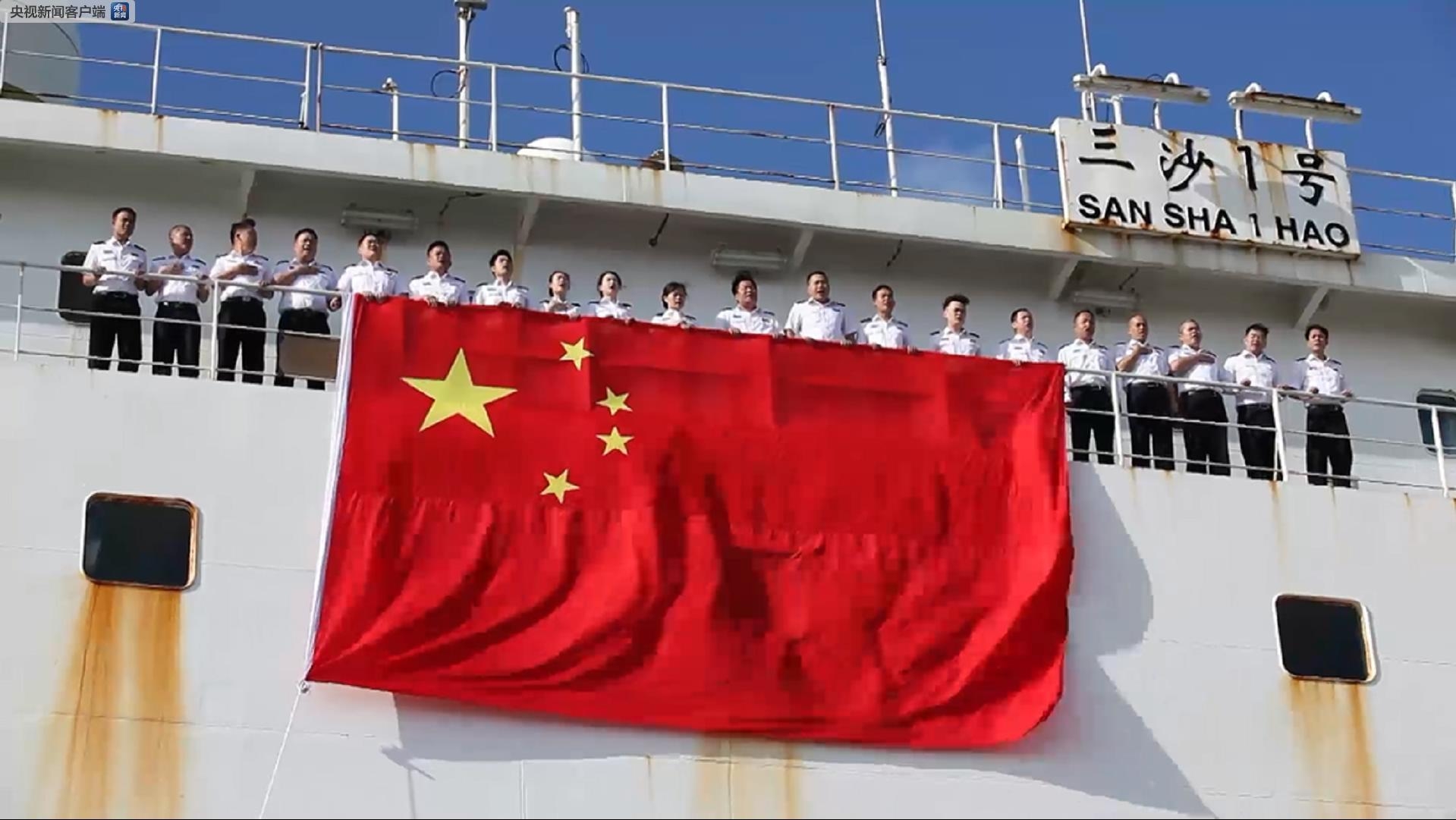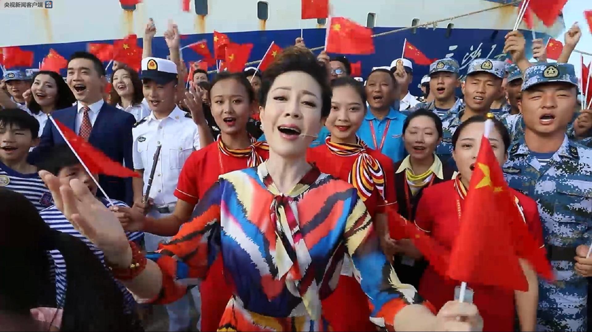 三沙市永兴学校小学生胡楚涵和她的同学们、三沙卫视主持人团、“三沙1号”船工作人员、驻岛工作人员、渔民依次加入演唱,清脆稚嫩的童声与深情的歌声交融,伴着海风,伴着朝阳,这专属于中国人的旋律缓缓流淌。激昂的歌声、挥动的国旗将码头渲染成了激情澎湃的“红色”海洋,让在场的每颗中国心都热血沸腾。