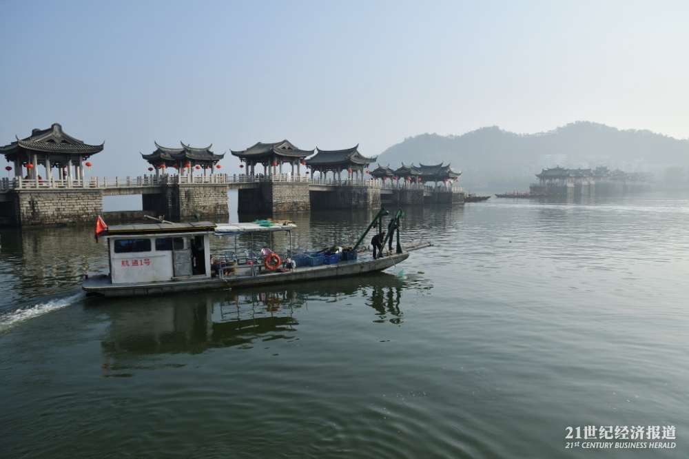 不过,如果每天起得更一点,这座古城其实有着宁静的一面。2月6日(正月初二),一艘韩江水上清洁船正在广济桥附近水域作业。这是一座集拱桥、梁桥及浮桥于一体,为中国第一座启闭式浮桥。始建于南宋乾道七年(公元1171年),古代闽粤交通要道。春节期间(2月4日至2月10日)门票价格8折,15元/人。最初,其票价曾高达60元。2009年降至50元,2017年又降至20元。