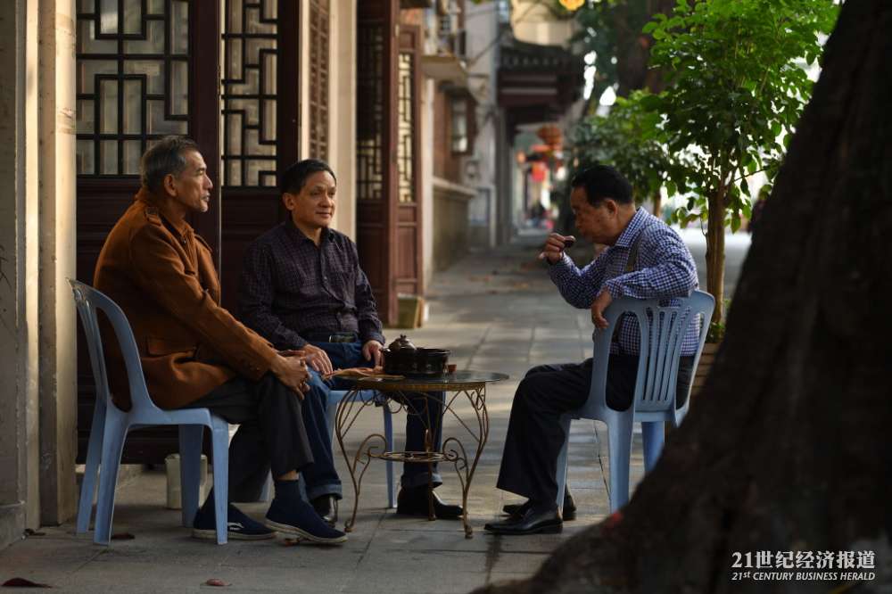 2月6日(正月初二),潮州古城太平街。三位长者在人行道上喝工夫茶。中为临街古玩及瓷器店店主,以茶待客者。潮州人称饮茶为“食茶”。三餐后常常要冲茶,日常交谈也离不开茶。
