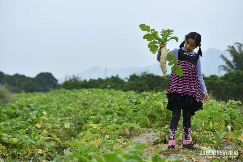 2月2日(腊月廿八),意溪镇莲上村。9岁的姚欣明(音)展示她刚从地里拔出的白萝卜。这是当地风味小食“菜头粿”(萝卜糕)的主要原材料。菜头粿也可以用来祭祖或拜神(土地公)。