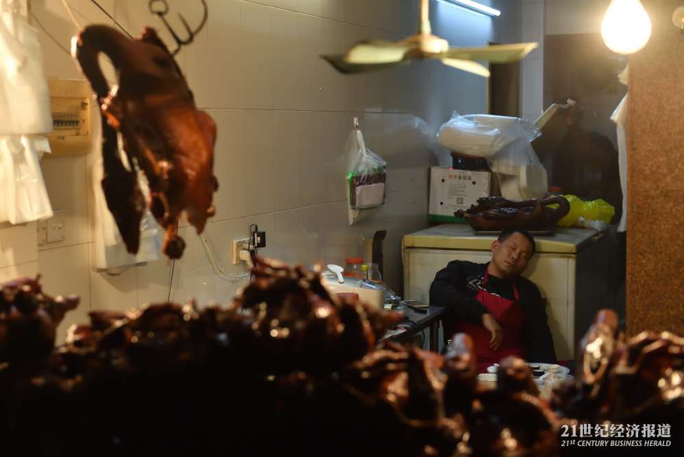 2月4日(腊月三十),上西平路,溪口阿卜鹅肉店的帮工正在打盹,在节前几天,他们需要24小时工作,制作超过200只卤鹅。今年卤鹅的价格约为每斤50元,与去年相当。鹅肉为当地除夕祭祖必备之供品。
