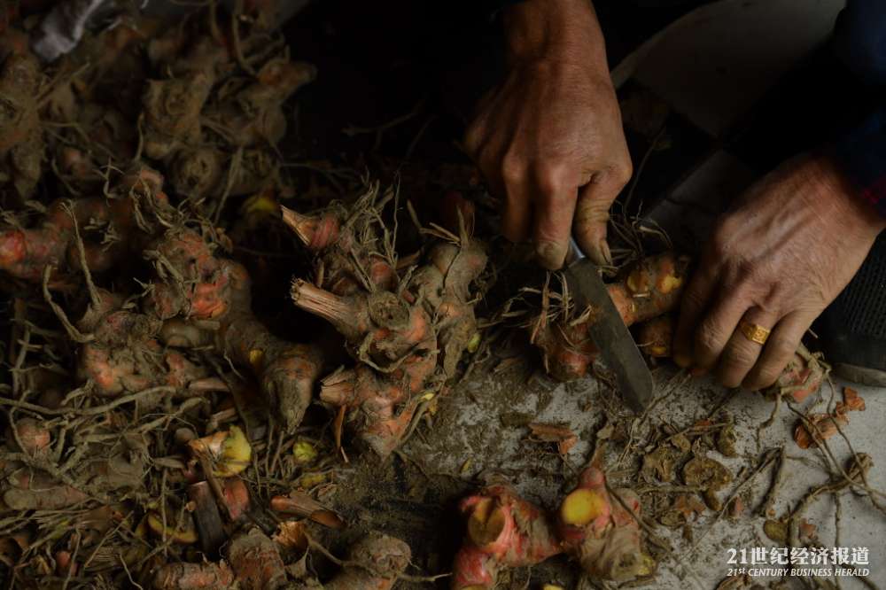 2月2日(腊月廿七),岳伯亭市场。产自潮州文祠镇山地的南姜(Alpinia officinarum),4元一斤。较烹调常用的生姜结实且性味强烈,多用于卤制鹅只、猪肠或腌制橄榄(橄榄糁)、芥菜(贡菜)、萝卜(菜脯)等。图为销售者正在削须去土,并把因挖掘不当造的腐烂部分切掉。