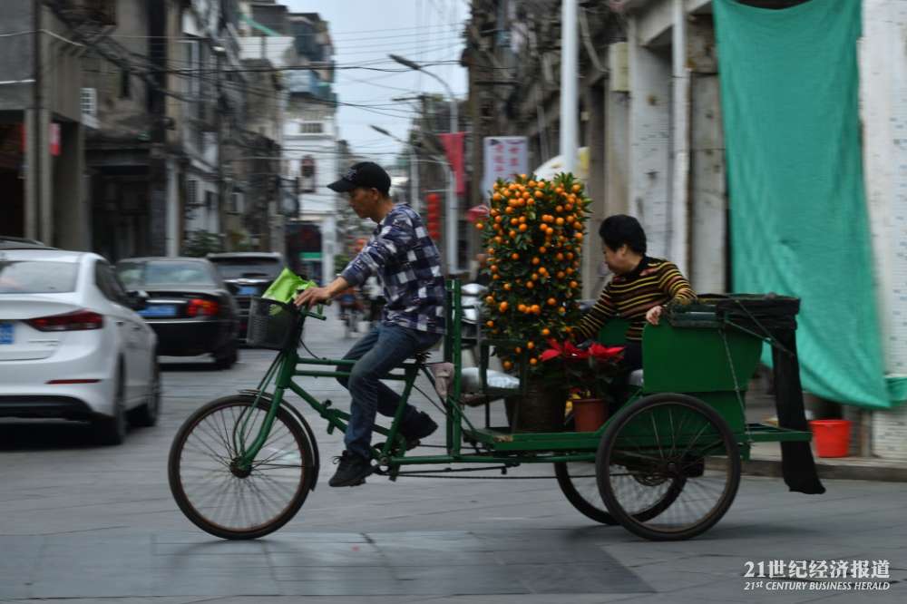 1月31日(腊月廿六),太平街。当地的日常版人力三轮车。一位长者花了180元购得一棵盆栽金桔。家中摆桔寓意“大吉大利”。