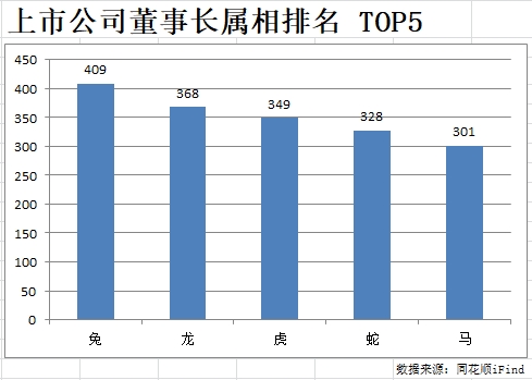 同花顺iFind的数据库统计了3583家上市公司董事长的出生信息。数据显示,农历猪年诞生的董事长竟然是十二生肖年份中数量最少的,诞生最多上市公司董事长的是农历兔年,共有409位董事长。紧随其后的是龙、虎、蛇、马年,分别诞生了368位、349位、328位、301位董事长。