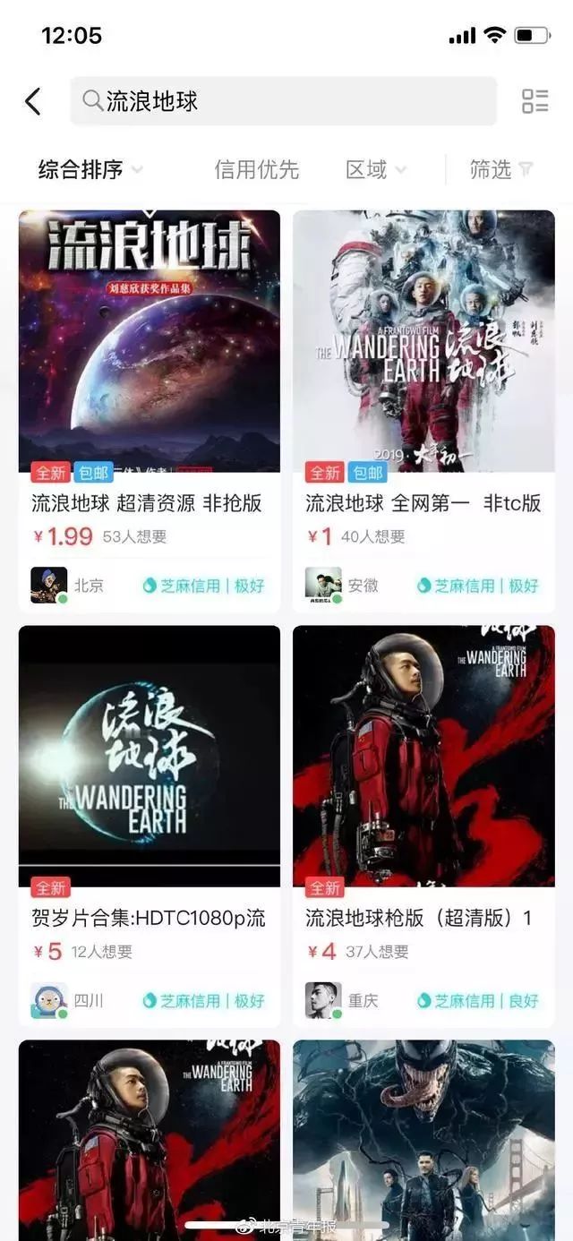 《流浪地球》在吸引观众的同时,也吸引了不怀好意的盗版者。有卖家在某二手平台叫卖盗版《流浪地球》,声称是完整版高清资源,售价低至1元,更有甚者将正热映的多部贺岁片打包出售,售价不过2元。
