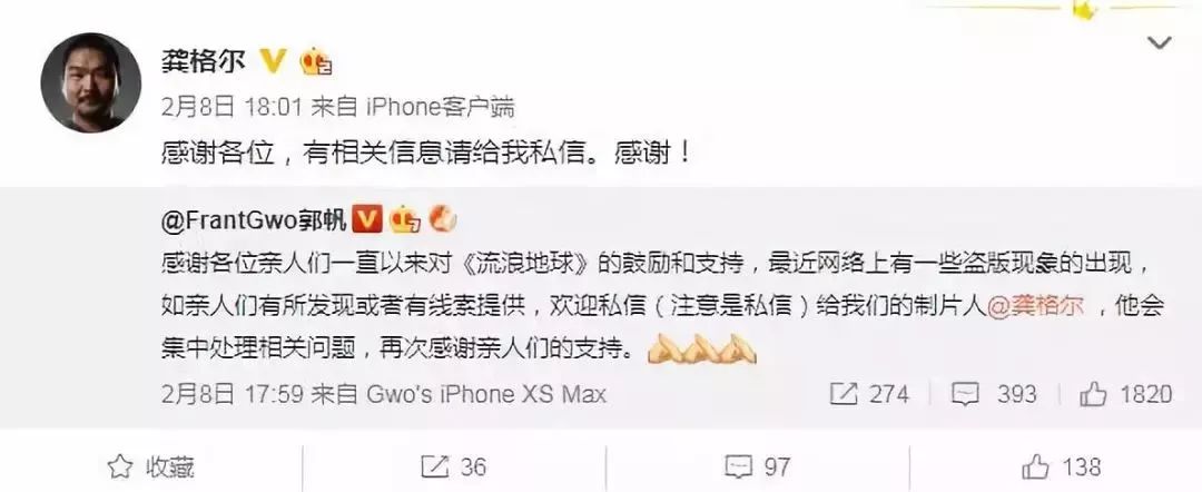 早在两天前,各大片方就已经发现了这次盗版的情况,开始着手处理,并已于8日向电影局反映此事。《流浪地球》导演郭帆及制片人龚格尔也在8日发布微博,呼吁网友举报盗版。