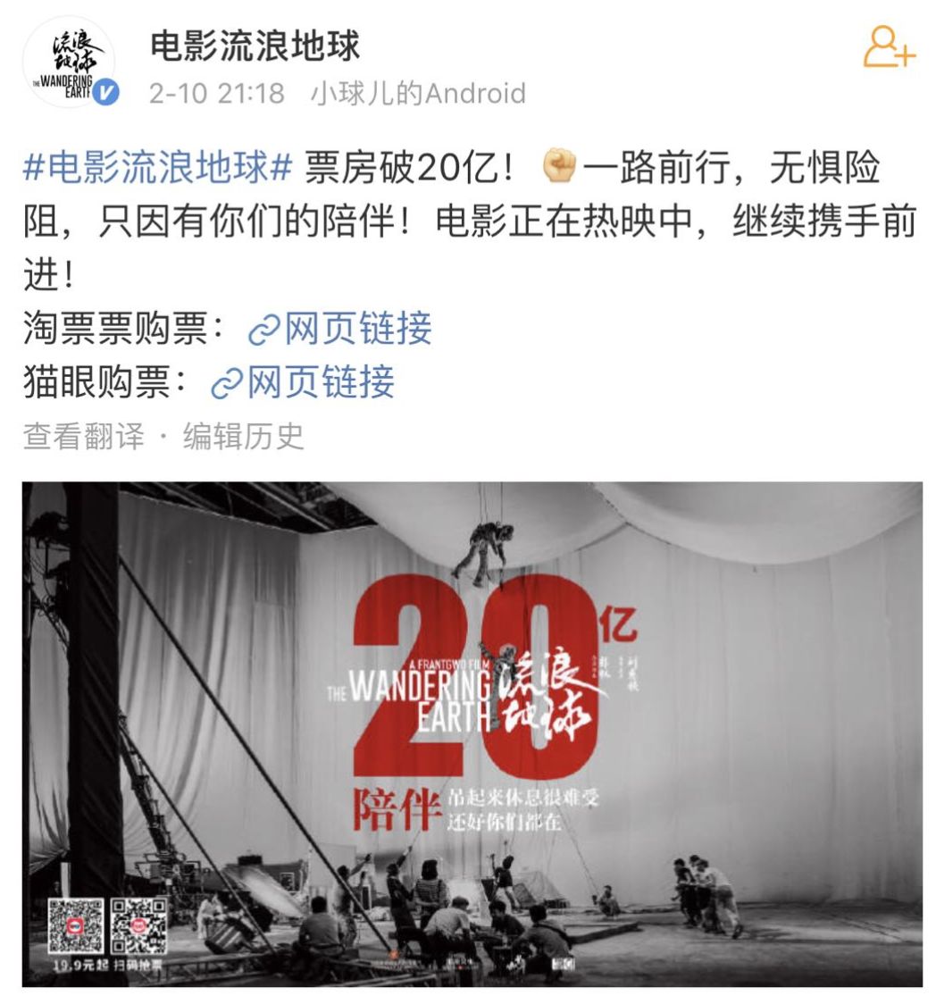 北京时间2月10日21时28分,电影《流浪地球》官方微博宣布票房累计突破20亿元。