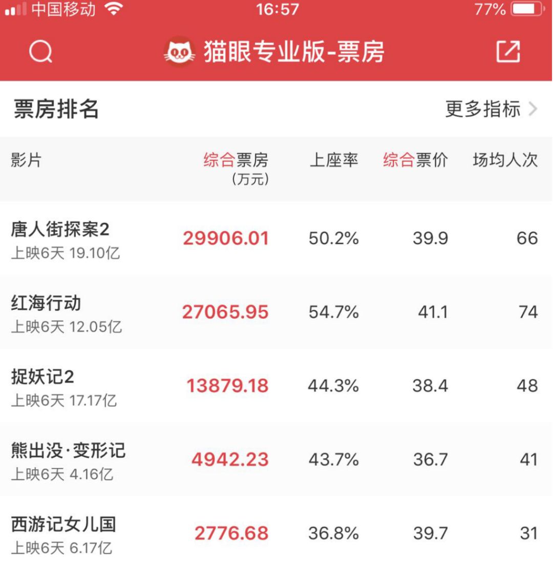 拥有全明星阵容《疯狂的外星人》曾被认为票房冠军大热门,猫眼给出了36.46亿元的总票房预测。大年初一,《疯狂的外星人》票房4.07亿元,观影人次达896.6万,排片占比20.4%;而排片占比20.9%的《飞驰人生》票房仅3.18亿元。票房居第三四位分别是《新喜剧之王》的2.72亿元、《流浪地球》的2.02亿元。