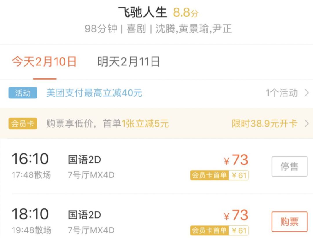 ——平时大家习惯了20-30元左右的价位看电影,但春节期间票价涨至60-70元甚至百元以上。记者注意到,一张《飞驰人生》的2D电影票,在国内某四线小县城的票价竟达到了73元。