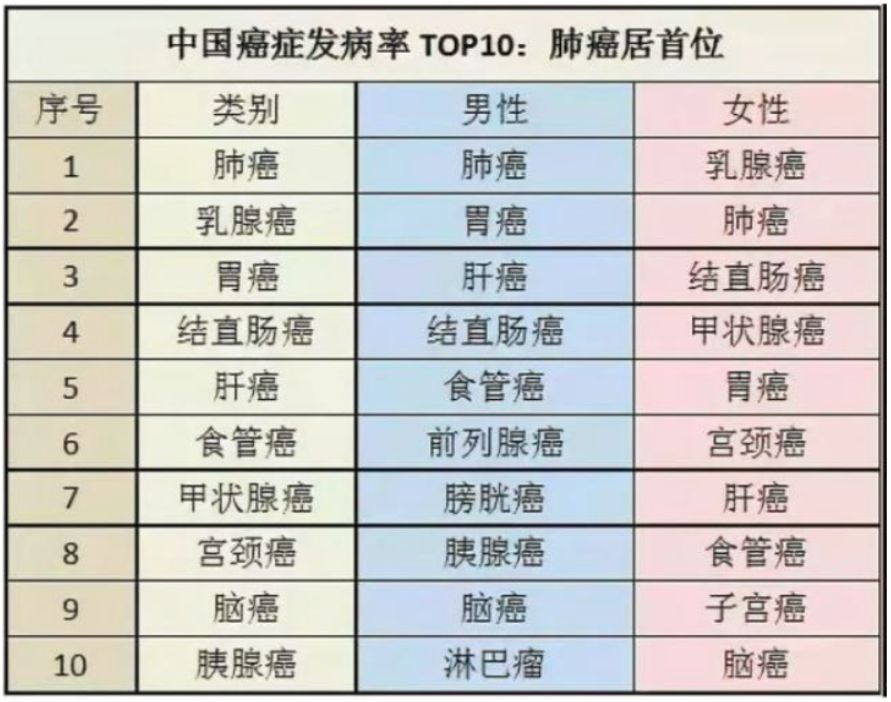 具体按性别分类,男性恶性肿瘤前五位分别是肺癌(22%)、肝癌(12%)、肠癌(11%)、胃癌(9%)、食道癌(5%),女性恶性肿瘤前五位的分别是乳腺癌(24%)、肺癌(14%)、宫颈癌(10%)、肠癌(5%)、胃癌(3%)。