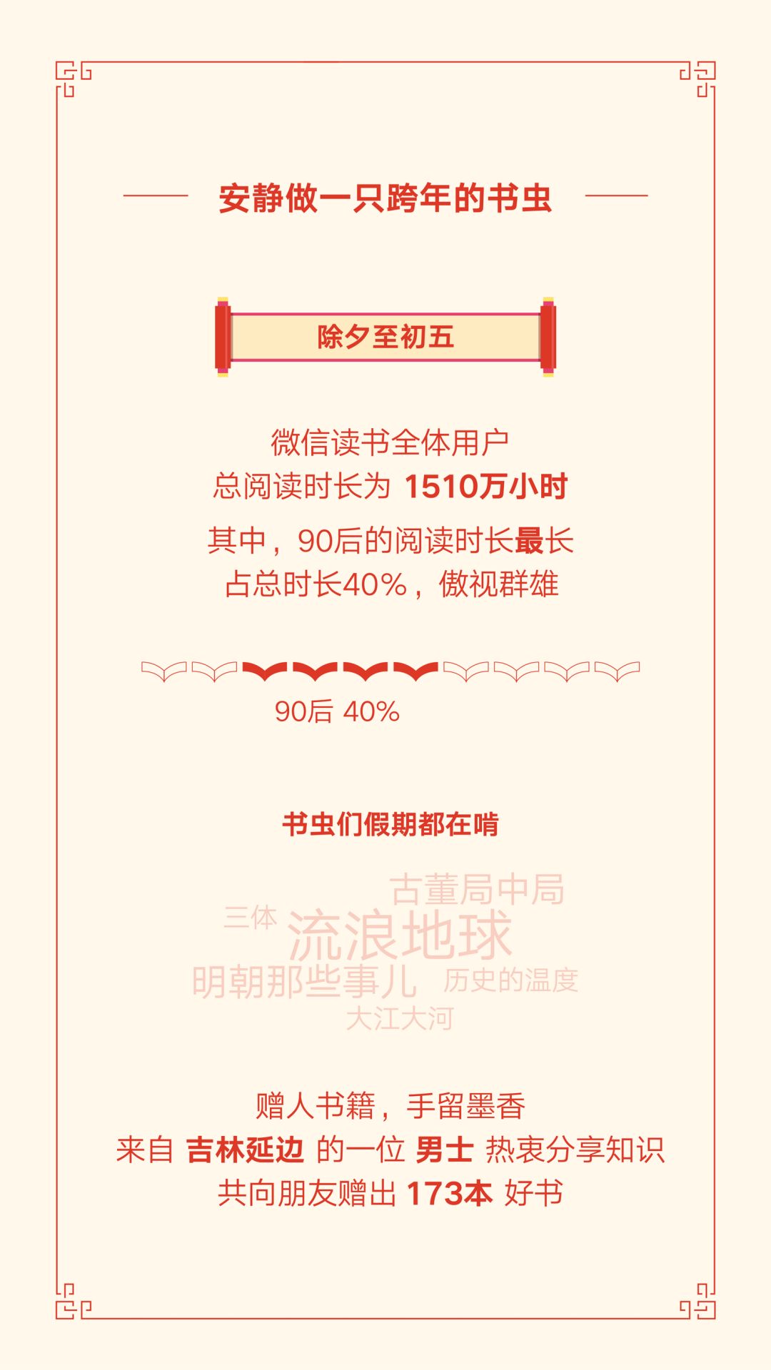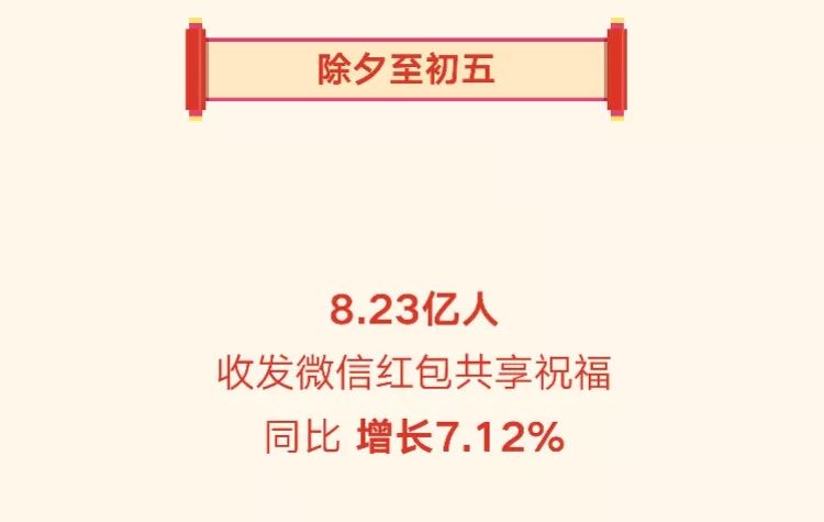 数据显示除夕到初五期间,在微信中,共发生的消息发送量较去年同期增长64.2%。除夕当天,用户在微信上的活动最频繁,单日消息和朋友圈信息量达到顶峰。