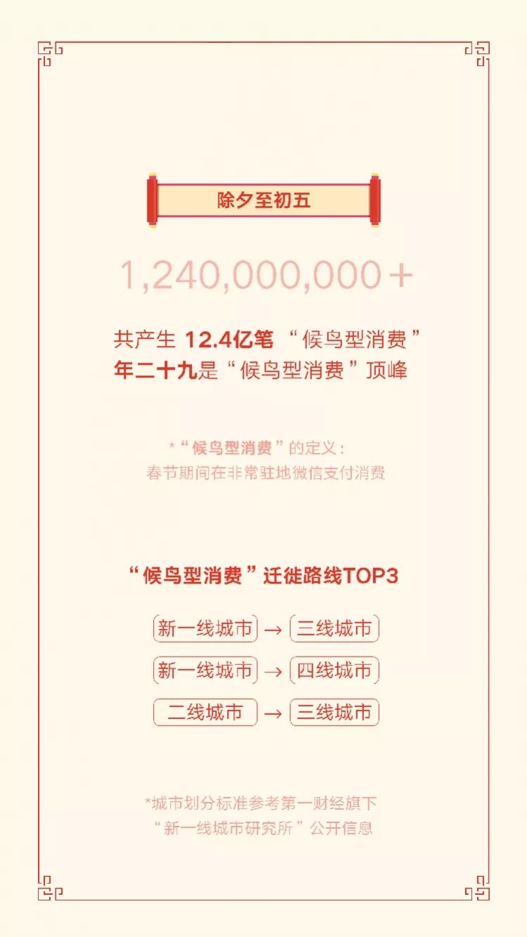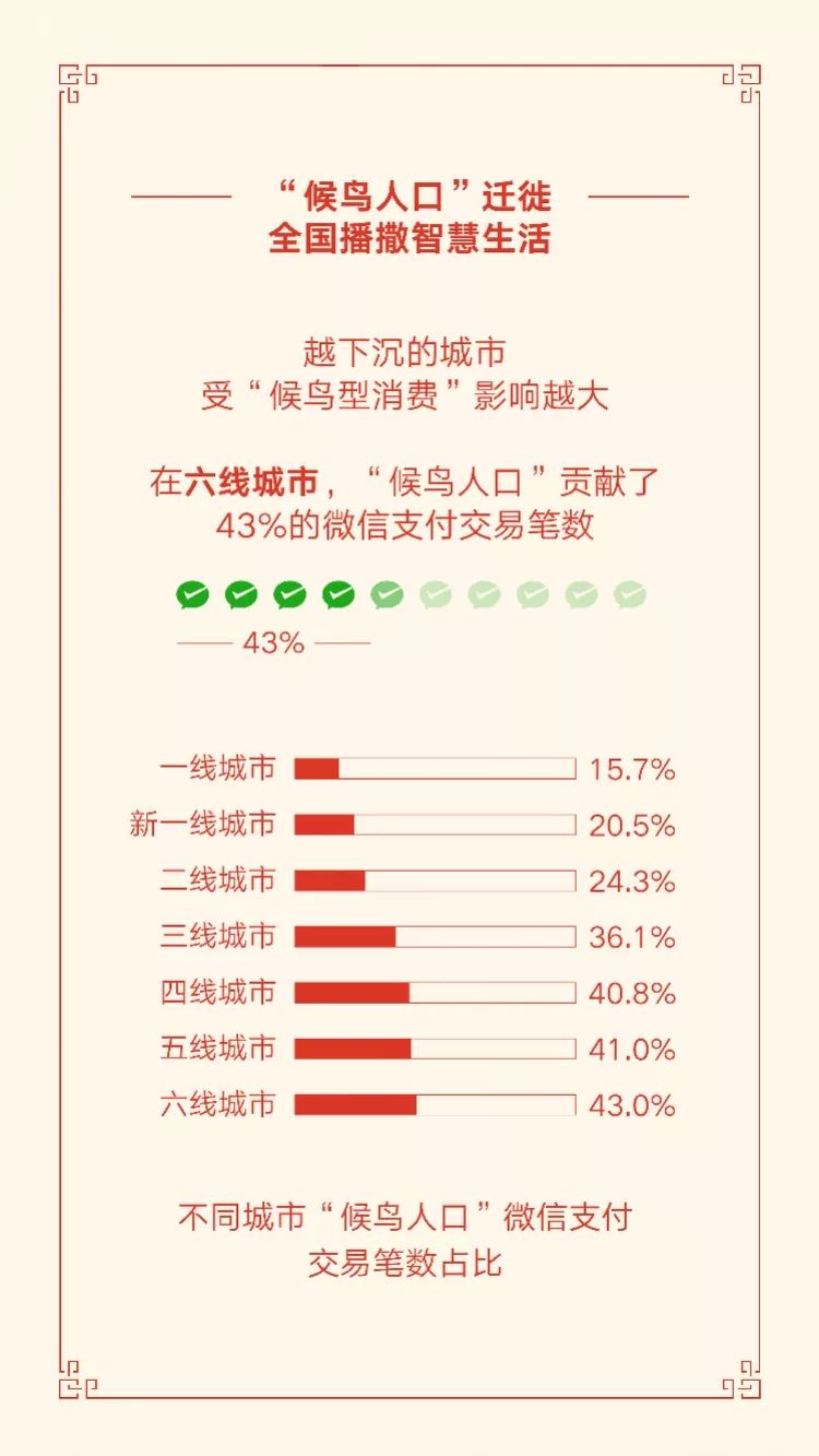 春节期间,全国范围内共产生了12.4亿笔“候鸟型消费”,其中由新一线城市向三线、四线城市迁移的微信支付消费笔数最多。在六线城市,“候鸟人口”贡献了43%的微信支付交易笔数,四五六线城市“候鸟人口”微信支付交易笔数占比均超过40%。