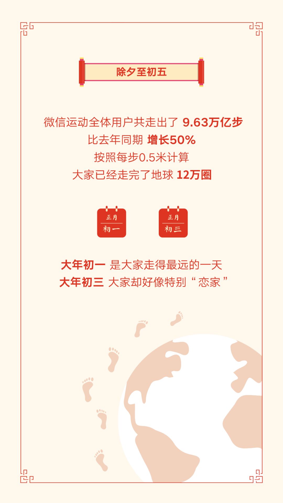 微信官方发布2019年春节数据报告显示,除夕到初五,微信运动全体用户共走出了9.63万亿步,同比增长50%。按照平均每步0.5米计算,微信运动全体用户已经“走完”地球12万圈,其中,1.3亿人走出步数超过10000的成绩。大年初一是大家走得最远的一天,大年初三大家却好像特别“恋家”。