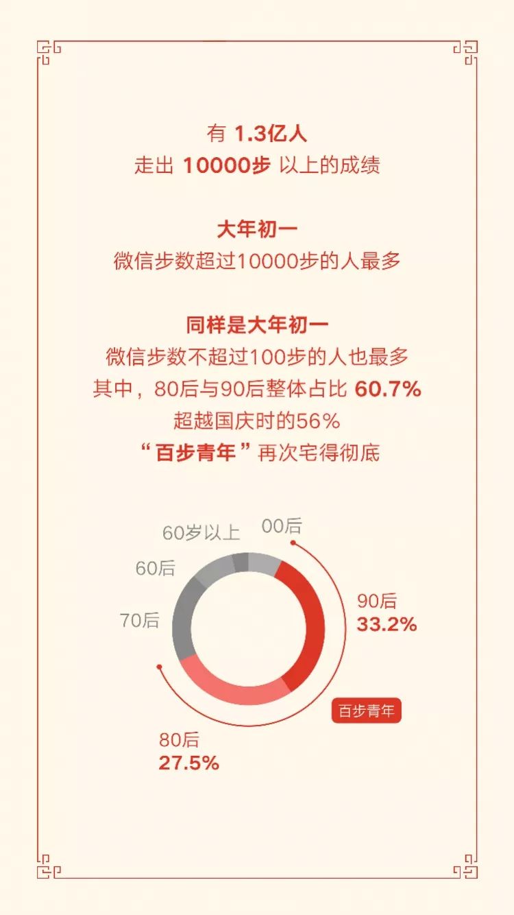 有意思的是,大年初一的国民运动量形成两极分化,这一天步数超过10000步的人最多,但同时,微信运动步数不足100的人数也最多,其中80后与90后整体占比60.7%,超越国庆时的56%,“百步青年”再次宅得彻底。