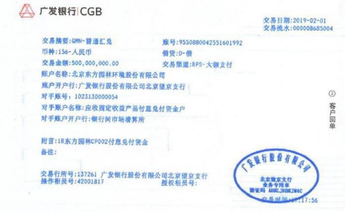 不过,据21世纪经济报道记者了解,当日晚间有机构投资者晒出东方园林方面该期债券的兑付转账回执单,显示5亿元本金已在2月1日划付至银行间市场清算所。