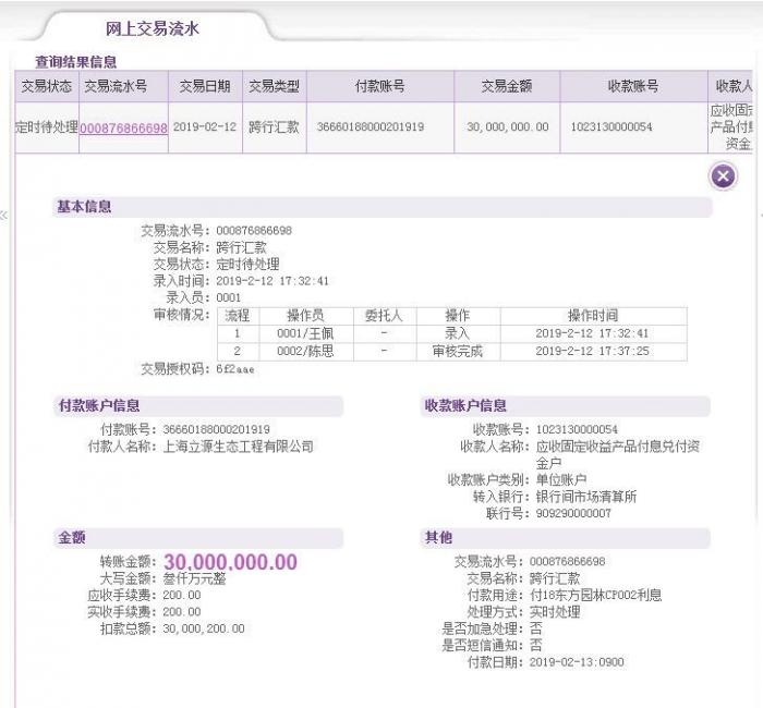 东方园林方面回应称,“该笔东方园林CP002到期日为2019年2月12日,我司已于春节前将5亿本金汇至上清所账户,剩余3000万利息原计划于今日上午汇出。但由于节后财务人员上班较晚,工作疏忽,未了解上清所系统关账时间,导致我司已汇出(通过全资子公司上海立源),但上清所未收到,明日9点大额开账之后即可到账。特此澄清,网银截图如附。”