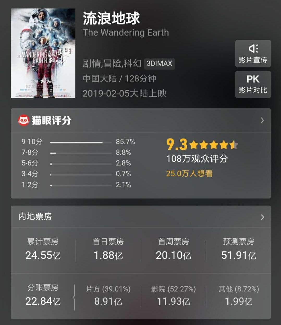 截至2月12日午间,《流浪地球》的票房已经达到24.55亿元,领先此前被视为其最大对手的《疯狂的外星人》8亿元,成为此次春节档电影市场的最大赢家。据猫眼专业版预计,《流浪地球》的最终票房或达51.91亿元,仅次于此前创下内地电影市场票房纪录《战狼2》的56.83亿元。