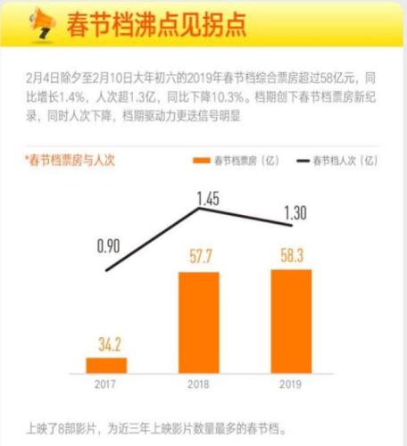 2019年的春节档被人称为“神仙打架”,据猫眼研究院发布的数据报告,从除夕到大年初六,春节档综合票房超过58亿元,同比增长1.4%,再次刷新记录。