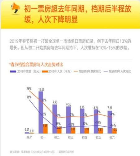 高涨的票价带来的不仅仅是观众的吐槽。猫眼报告显示,今年大年初一的票房超过去年同期,但是,从初二开始票房与去年同期持平,人次维持在10-15%左右的跌幅。