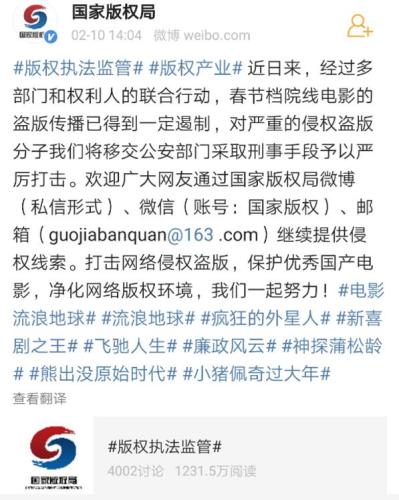 近日,国家版权局将春节档的8部影片列入“2019年度第一批重点作品版权保护预警名单”,并强调,直接提供内容的网络服务商在影片上映期内不得提供名单内的作品。随后,国家版权局在官微发布声明,表示对严重的侵权盗版分子,将移交公安部门采取刑事手段予以严厉打击。