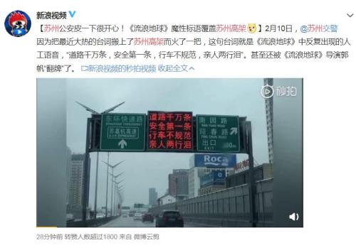 在高涨的观影热情下,春节期间出现了很多与电影有关的讨论,导演郭帆、作者刘慈欣、主演吴京等等和电影相关的人物故事也频频登上热门。苏州交警还把电影台词搬上了高架:“道路千万条,安全第一条,行车不规范,亲人两行泪。”