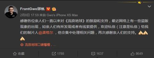 2月8日,《流浪地球》导演郭帆发了一条微博,希望大家帮忙提供盗版线索,呼吁人们支持正版。