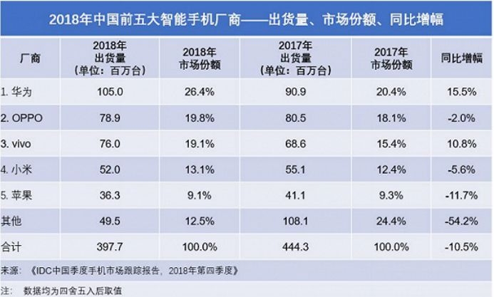 IDC最新数据显示,2018年,受消费者换机周期拉长,碎片化智能终端分流等因素影响,国内智能机整体市场出货量同比下滑超10%。
