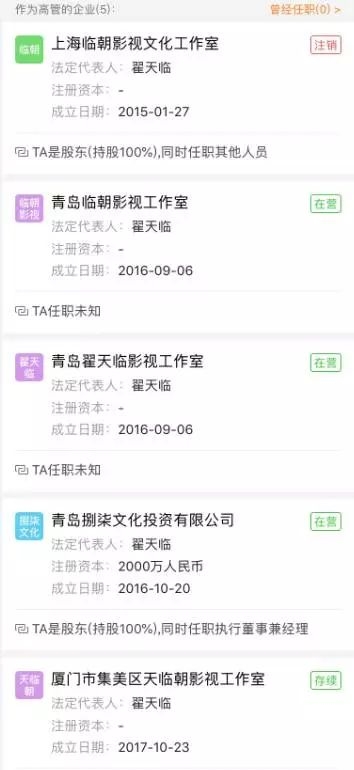 中新经纬查询天眼查发现,与翟天临有关的共有6家公司,主要涉及影视文化业务,其中,由翟天临100%控股的有3家公司,分别为:上海临朝影视文化工作室(已注销)、青岛捌柒文化投资有限公司、厦门市集美区天临朝影视工作室。