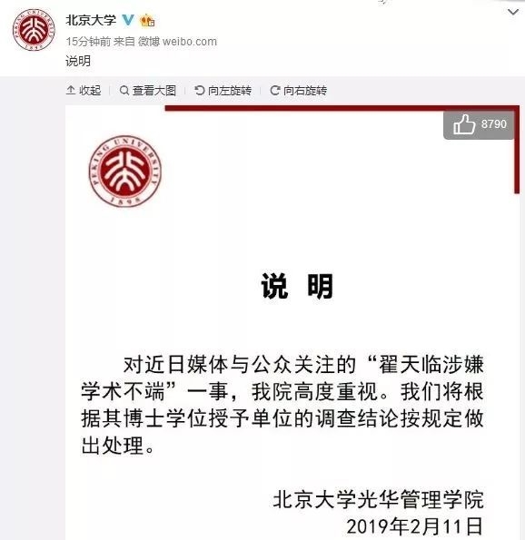就在2月11日晚间,针对翟天临论文事件,北京电影学院称对此高度重视,已成立调查组并按照相关程序启动调查程序。学校表示高度重视学术道德建设,对学术不端行为持零容忍态度。随后,北京大学光华管理学院也发布声明表示,将根据其博士学位授予单位的调查结论做出处理。