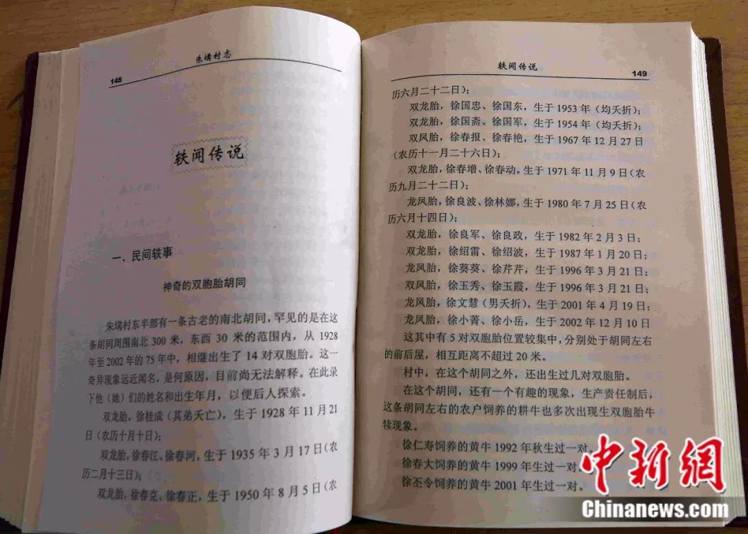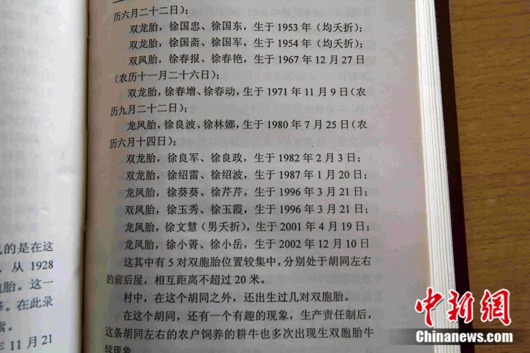 徐春天从包里拿出一本有些泛黄的村志,一边翻一边说,他们村从1928年就有生双胞胎的记载了。