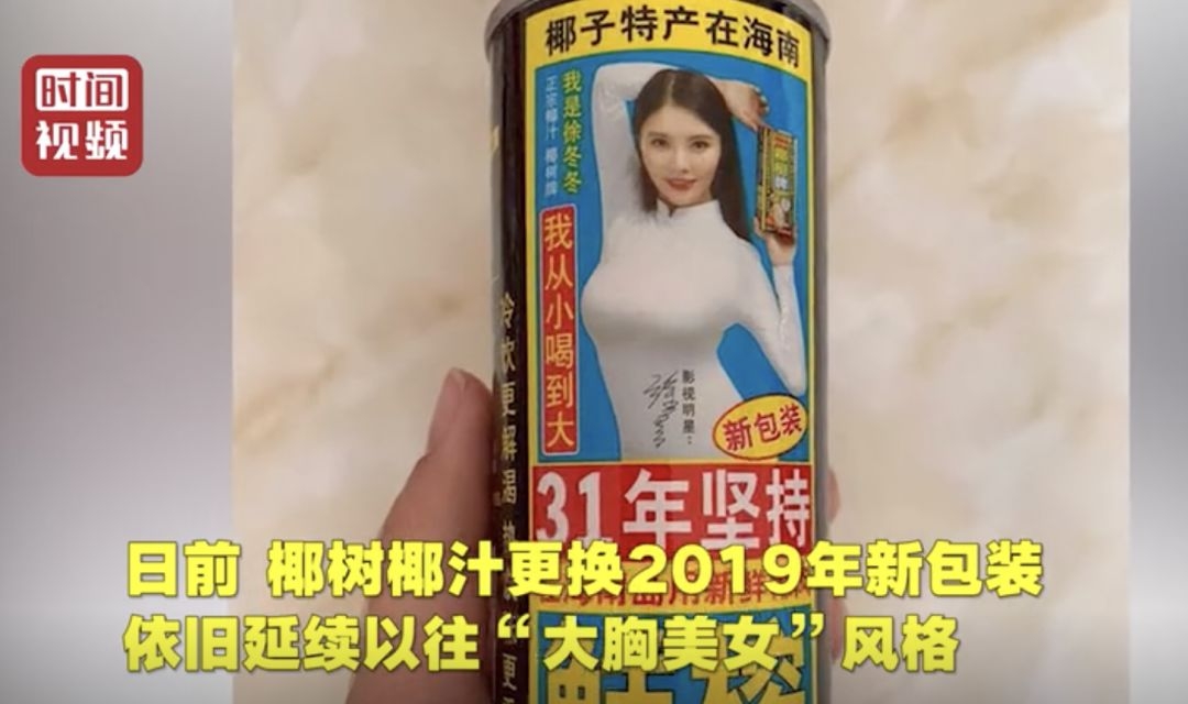 每日经济新闻记者注意到,此次椰树椰汁引起争议的出位广告主要分为两方面:其一就是对产品包装的更新,在拥挤的瓶身上腾出位置放了代言人徐冬冬的照片。照片上的徐冬冬衣着紧身曲线玲珑。这一包装更新内容本身并无问题,但是结合椰树椰汁一直以来的“丰胸”卖点,加之印在徐冬冬身旁的“我从小喝到大”字眼,不禁让消费者浮想联翩。