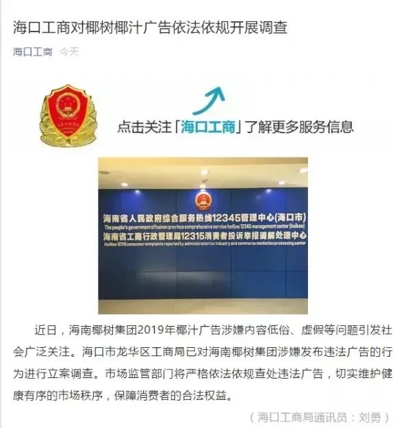 对此,今天下午,海口市工商局办公室刘副主任告诉每日经济新闻记者,当地工商局已于本月12日开始对椰树椰汁广告问题进行调查。