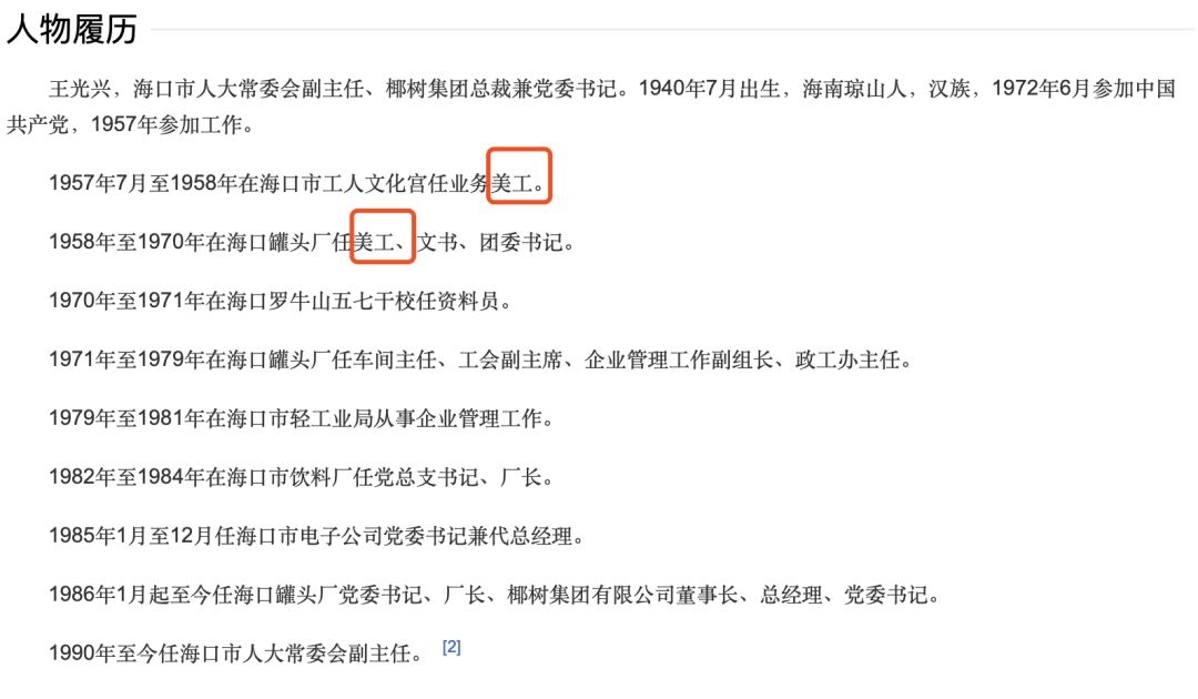 公开资料显示,王光兴于1986年出任椰树集团前身——海口罐头厂厂长一职。而在之前,王光兴在海口市工人文化宫当过美工,加入海口厂最开始的工作也是美工及文书。而根据海南当地媒体的报道,王光兴还在1984年撰写了包装设计论文:《我们是怎样改进装潢促进生产开创新局面的》并在海南包装装潢学术研究会上发表,被评为海南优秀科学论文二等奖。