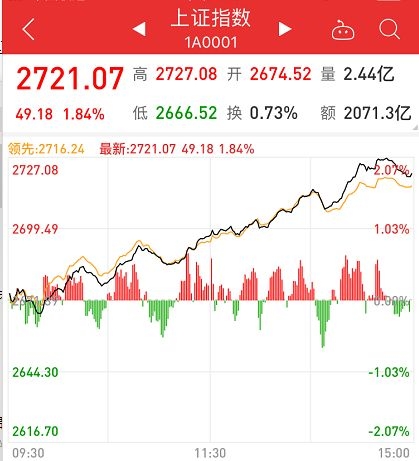 今日早盘上证指数略微高开0.1%后,稍加震荡而后一路走高,收盘大涨1.84%,收报2721.07点,站上2700点,报收一根大阳线,创出去年10月以来新高;成交额也突破了2000亿元。