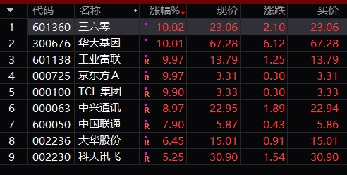 不只是京东方A、TCL集团,今日工业富联、360、华大基因、中兴通讯、中国联通、大华股份、科大讯飞等科技巨头股也纷纷涨停或是大涨。