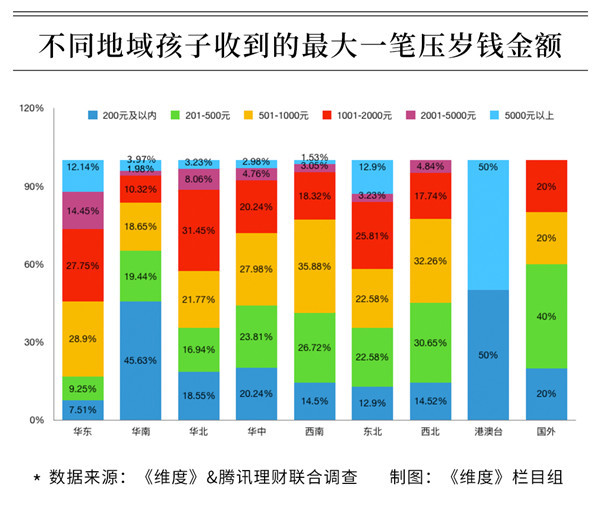 《维度》调查中的一些数据也印证了这一观点。数据显示在华东地区(江浙沪一带)过年的孩子,超2成(21.96%)收到的压岁钱过万,超半数(54.34%)收到的最大一笔压岁钱都在1000元以上,其中近3成(26.59%)更是超过2000元。