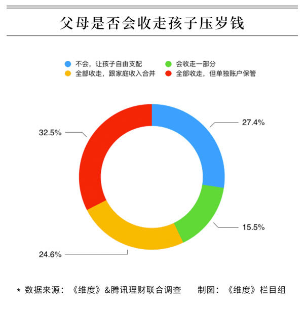 跟杨杨妈妈一样,《维度》调查中,近6成(57.1%)父母都会将子女的压岁钱全部收走,只有27.4%的家长会让孩子完全自由支配压岁钱,不予干涉,还有15.5%的家长表示会收走一部分压岁钱。