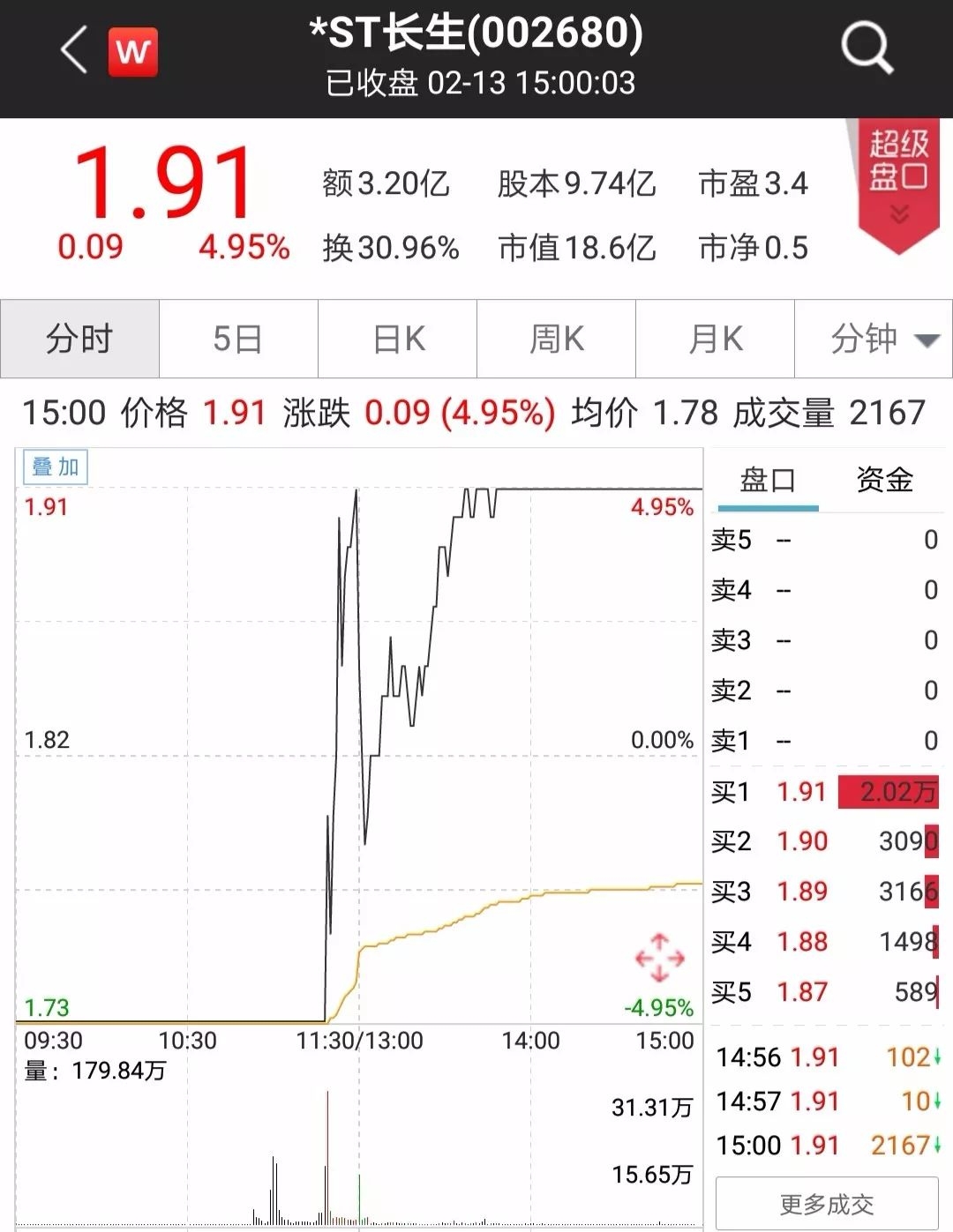 13日早盘,*ST长生打开跌停板,直线拉升并触及涨停后回落;午后,*ST长生再次震荡上行并最终封于涨停,上演日内“地天板”。截至收盘,*ST长生收报1.91元/股,涨幅为4.95%,成交金额达3.2亿元,换手率超过30%。